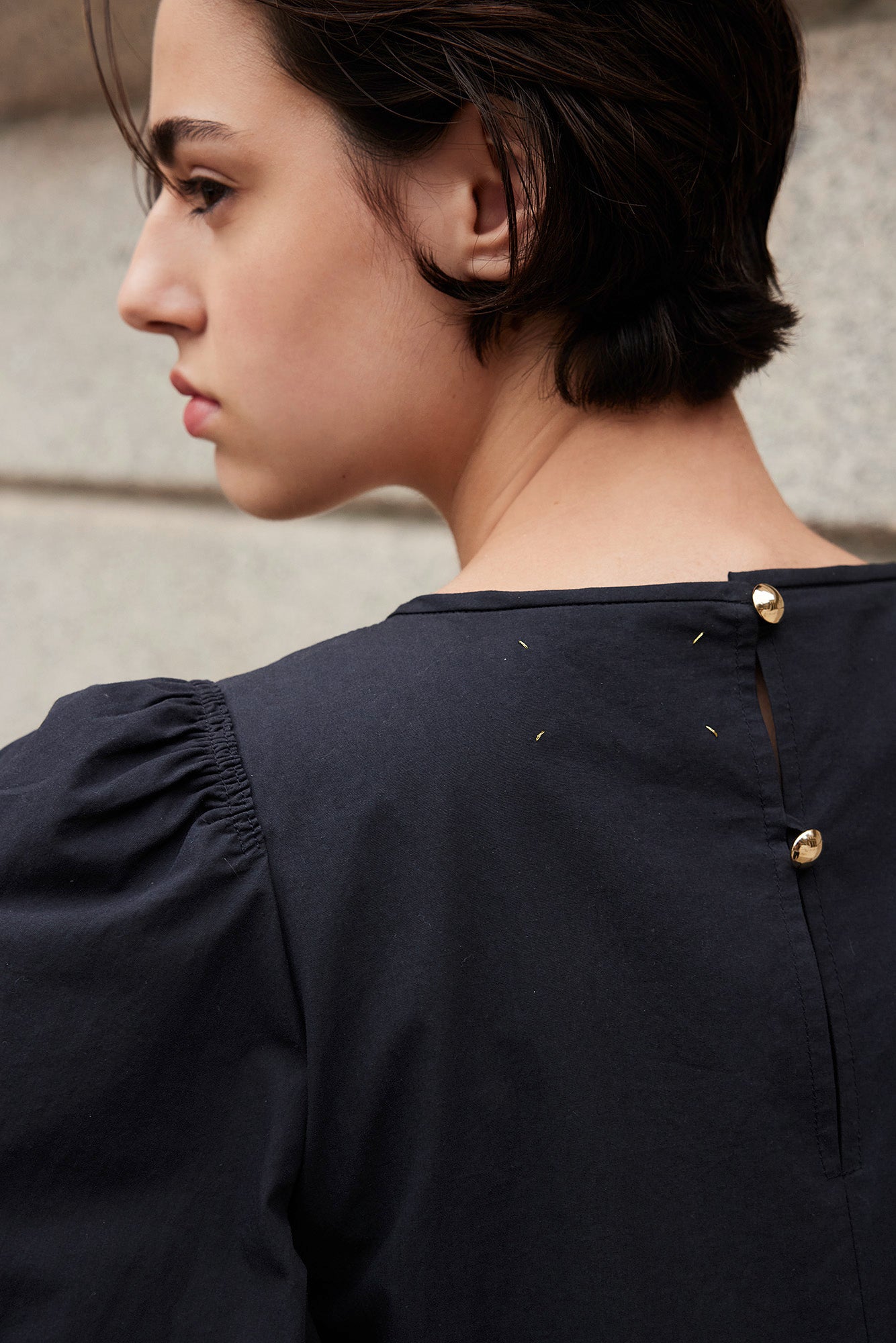Das Midikleid LOU hat kleine Puffärmel und seitliche Eingrifftaschen. Das Kleid wird hinten durch zwei goldene Schmuckköpfe geschlossen. Gesamtlänge ab Schulter 120 cm.