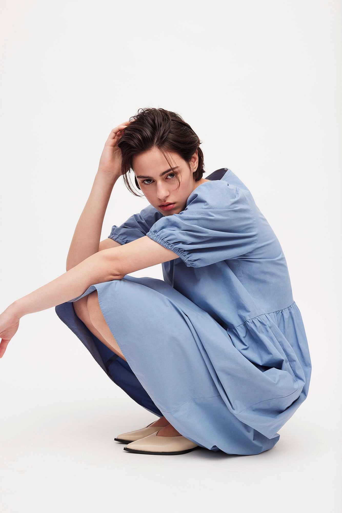 Das Midikleid LOU hat kleine Puffärmel und seitliche Eingrifftaschen. Das Kleid wird hinten durch zwei goldene Schmuckköpfe geschlossen. Gesamtlänge ab Schulter 120 cm.
